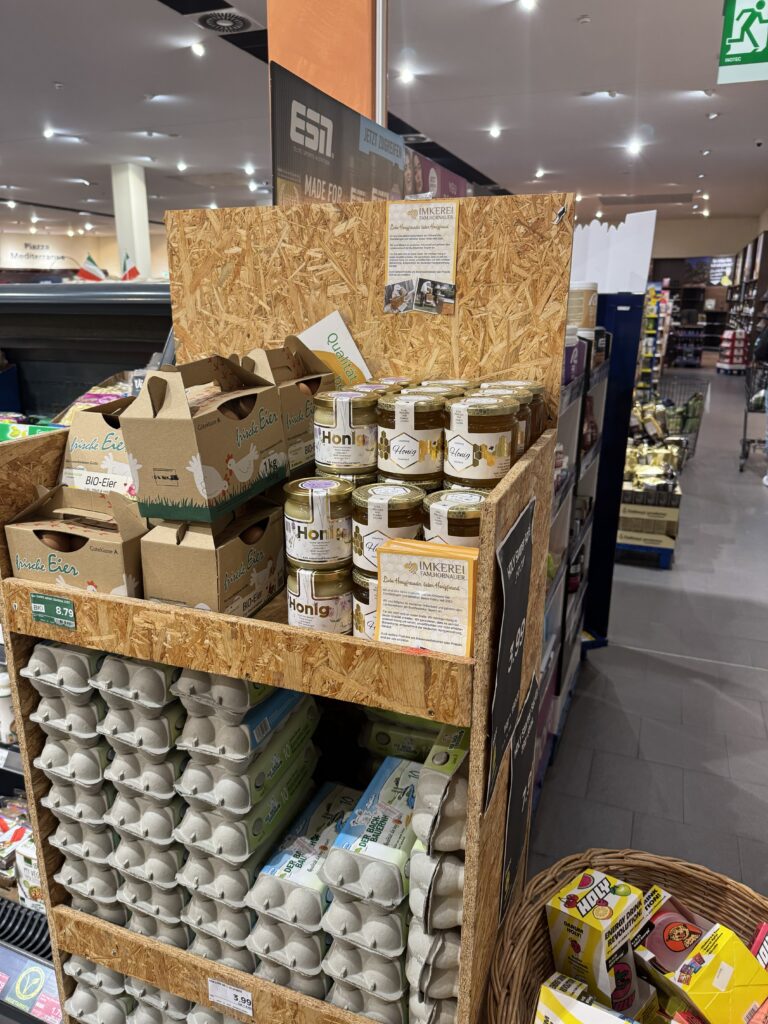Unser Honig ist auch bei Edeka Altun in Rain am Lech zu finden. Je nach aktueller Bewerbung findest du unseren Honig so wie hier dargestellt in der Regionalecke direkt am Eingang oder ein paar Schritte weiter im Honigregal selbst.